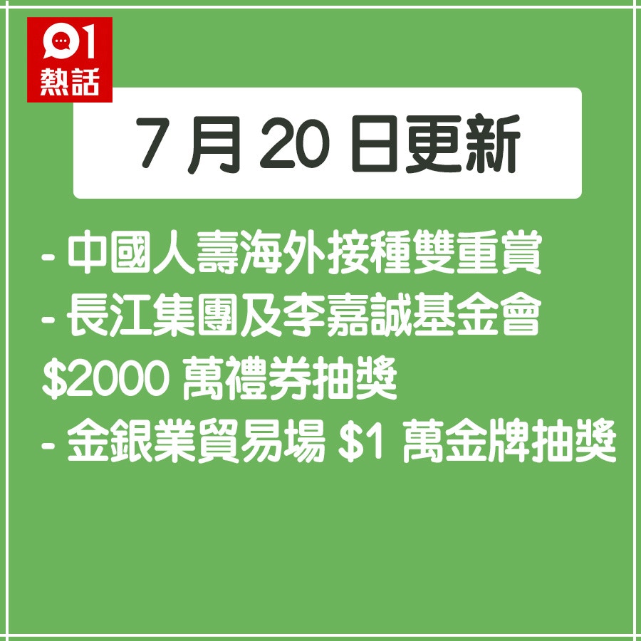 李嘉誠基金會及長江集團推2000萬元大抽獎 長江集團公布,長實 (01113) 、長和 (00001) 將聯同李嘉誠基金會送出總值2,000萬元的禮券大抽奬,名額有36名,以鼓勵市民接種疫苗。
